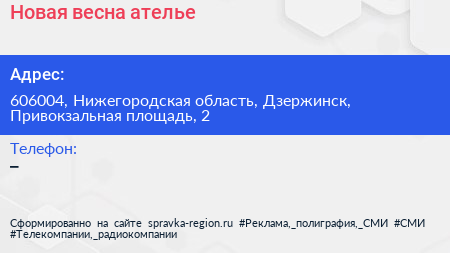 Новая весна, ателье по адресу 606004, Нижегородская область, Дзержинск, Привокзальная площадь, 2 в дальнейшем Организация, размещена в следующих категориях: