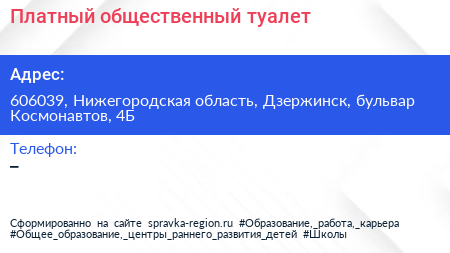 Платный общественный туалет по адресу 606039, Нижегородская область, Дзержинск, бульвар Космонавтов, 4Б в дальнейшем Организация, размещена в следующих категориях: