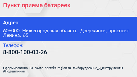 Пункт приема батареек по адресу 606000, Нижегородская область, Дзержинск, проспект Ленина, 65 в дальнейшем Организация, размещена в следующих категориях: