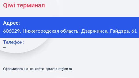 Qiwi, терминал по адресу 606029, Нижегородская область, Дзержинск, Гайдара, 61 в дальнейшем Организация, размещена в следующих категориях: