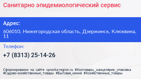 Санитарно-эпидемиологический сервис по адресу 606010, Нижегородская область, Дзержинск, Клюквина, 11 в дальнейшем Организация, размещена в следующих категориях: