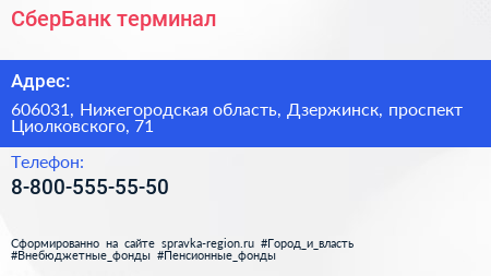 СберБанк, терминал по адресу 606031, Нижегородская область, Дзержинск, проспект Циолковского, 71 в дальнейшем Организация, размещена в следующих категориях: