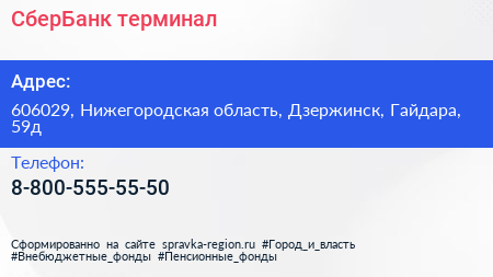 СберБанк, терминал по адресу 606029, Нижегородская область, Дзержинск, Гайдара, 59д в дальнейшем Организация, размещена в следующих категориях: