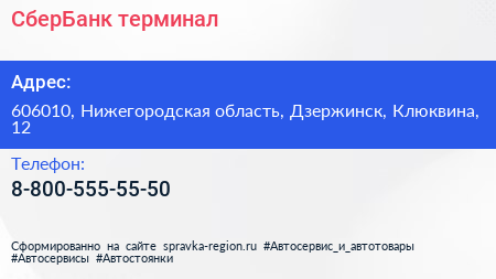 СберБанк, терминал по адресу 606010, Нижегородская область, Дзержинск, Клюквина, 12 в дальнейшем Организация, размещена в следующих категориях: