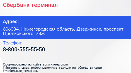 СберБанк, терминал по адресу 606034, Нижегородская область, Дзержинск, проспект Циолковского, 78ж в дальнейшем Организация, размещена в следующих категориях: