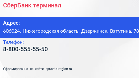СберБанк, терминал по адресу 606024, Нижегородская область, Дзержинск, Ватутина, 78 в дальнейшем Организация, размещена в следующих категориях: