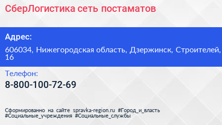 СберЛогистика, сеть постаматов по адресу 606034, Нижегородская область, Дзержинск, Строителей, 16 в дальнейшем Организация, размещена в следующих категориях:
