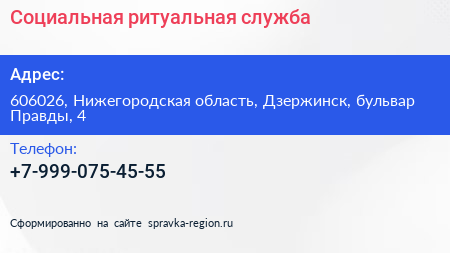 Социальная ритуальная служба по адресу 606026, Нижегородская область, Дзержинск, бульвар Правды, 4 в дальнейшем Организация, размещена в следующих категориях:
