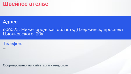 Швейное ателье по адресу 606025, Нижегородская область, Дзержинск, проспект Циолковского, 20а в дальнейшем Организация, размещена в следующих категориях: