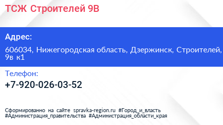 ТСЖ Строителей 9В по адресу 606034, Нижегородская область, Дзержинск, Строителей, 9в к1 в дальнейшем Организация, размещена в следующих категориях: