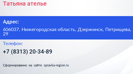 Татьяна, ателье по адресу 606037, Нижегородская область, Дзержинск, Петрищева, 29 в дальнейшем Организация, размещена в следующих категориях: