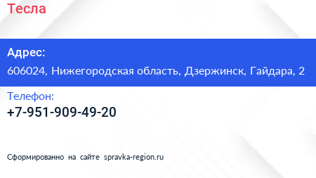 Тесла по адресу 606024, Нижегородская область, Дзержинск, Гайдара, 2 в дальнейшем Организация, размещена в следующих категориях: