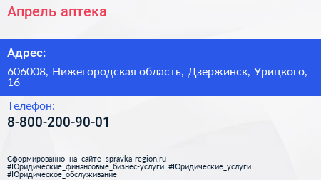 Апрель, аптека по адресу 606008, Нижегородская область, Дзержинск, Урицкого, 16 в дальнейшем Организация, размещена в следующих категориях: