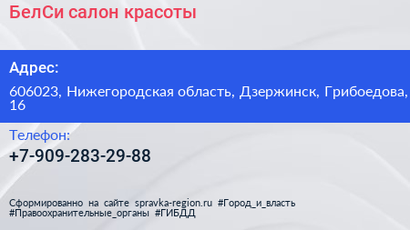 БелСи, салон красоты по адресу 606023, Нижегородская область, Дзержинск, Грибоедова, 16 в дальнейшем Организация, размещена в следующих категориях: