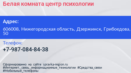 Белая комната, центр психологии по адресу 606008, Нижегородская область, Дзержинск, Грибоедова, 50 в дальнейшем Организация, размещена в следующих категориях: