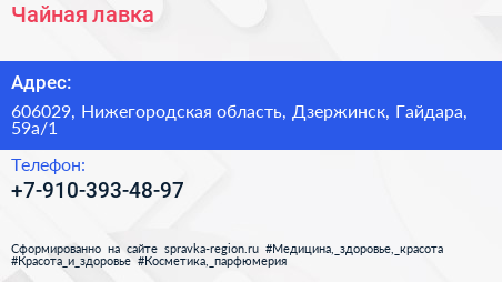 Чайная лавка по адресу 606029, Нижегородская область, Дзержинск, Гайдара, 59а/1 в дальнейшем Организация, размещена в следующих категориях: