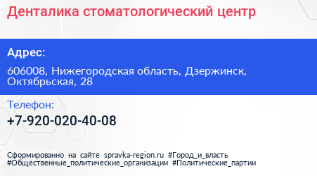 Денталика, стоматологический центр по адресу 606008, Нижегородская область, Дзержинск, Октябрьская, 28 в дальнейшем Организация, размещена в следующих категориях: