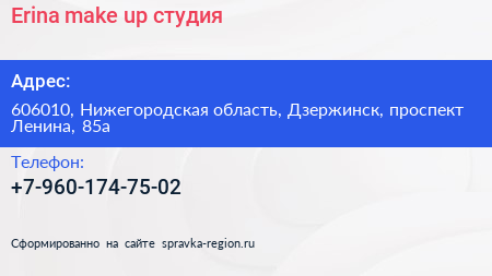 Erina make up, студия по адресу 606010, Нижегородская область, Дзержинск, проспект Ленина, 85а в дальнейшем Организация, размещена в следующих категориях: