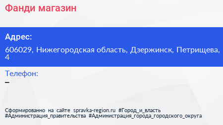 Фанди, магазин по адресу 606029, Нижегородская область, Дзержинск, Петрищева, 4 в дальнейшем Организация, размещена в следующих категориях: