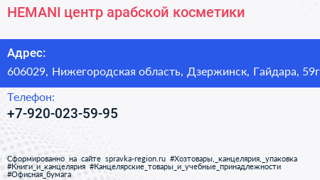 HEMANI, центр арабской косметики по адресу 606029, Нижегородская область, Дзержинск, Гайдара, 59г в дальнейшем Организация, размещена в следующих категориях: