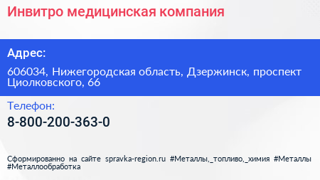 Инвитро, медицинская компания по адресу 606034, Нижегородская область, Дзержинск, проспект Циолковского, 66 в дальнейшем Организация, размещена в следующих категориях: