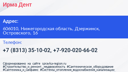 Ирма Дент по адресу 606010, Нижегородская область, Дзержинск, Островского, 16 в дальнейшем Организация, размещена в следующих категориях:
