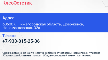 КлеоЭстетик по адресу 606007, Нижегородская область, Дзержинск, Новомосковская, 32а в дальнейшем Организация, размещена в следующих категориях: