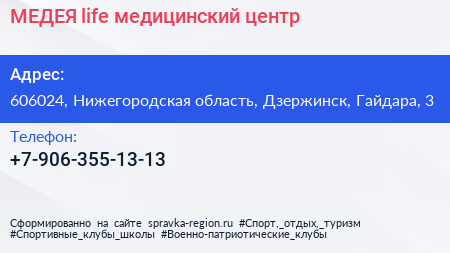 МЕДЕЯ life, медицинский центр по адресу 606024, Нижегородская область, Дзержинск, Гайдара, 3 в дальнейшем Организация, размещена в следующих категориях: