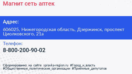 Магнит, сеть аптек по адресу 606025, Нижегородская область, Дзержинск, проспект Циолковского, 21а в дальнейшем Организация, размещена в следующих категориях: