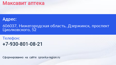 Максавит, аптека по адресу 606037, Нижегородская область, Дзержинск, проспект Циолковского, 52 в дальнейшем Организация, размещена в следующих категориях: