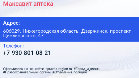 Максавит, аптека по адресу 606029, Нижегородская область, Дзержинск, проспект Циолковского, 47 в дальнейшем Организация, размещена в следующих категориях: