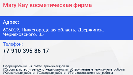 Mary Kay, косметическая фирма по адресу 606019, Нижегородская область, Дзержинск, Черняховского, 35 в дальнейшем Организация, размещена в следующих категориях: