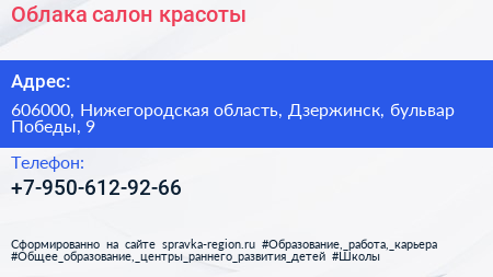 Облака, салон красоты по адресу 606000, Нижегородская область, Дзержинск, бульвар Победы, 9 в дальнейшем Организация, размещена в следующих категориях: