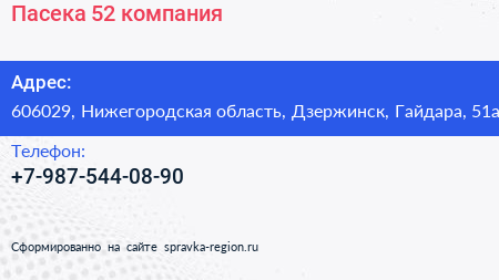 Пасека 52, компания по адресу 606029, Нижегородская область, Дзержинск, Гайдара, 51а в дальнейшем Организация, размещена в следующих категориях: