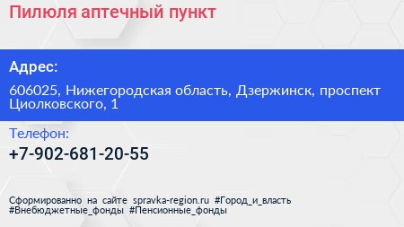 Пилюля, аптечный пункт по адресу 606025, Нижегородская область, Дзержинск, проспект Циолковского, 1 в дальнейшем Организация, размещена в следующих категориях: