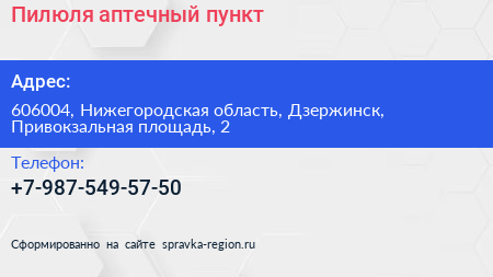 Пилюля, аптечный пункт по адресу 606004, Нижегородская область, Дзержинск, Привокзальная площадь, 2 в дальнейшем Организация, размещена в следующих категориях: