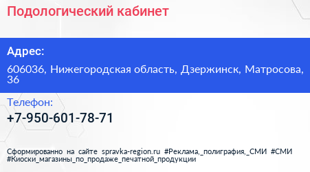 Подологический кабинет по адресу 606036, Нижегородская область, Дзержинск, Матросова, 36 в дальнейшем Организация, размещена в следующих категориях: