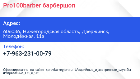 Pro100barber, барбершоп по адресу 606036, Нижегородская область, Дзержинск, Молодёжная, 11а в дальнейшем Организация, размещена в следующих категориях: