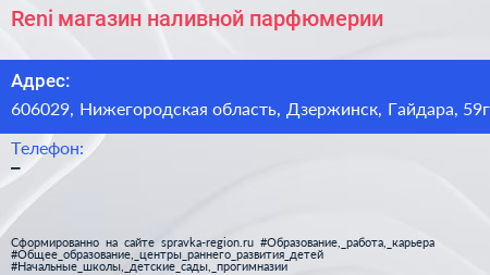 Reni, магазин наливной парфюмерии по адресу 606029, Нижегородская область, Дзержинск, Гайдара, 59г в дальнейшем Организация, размещена в следующих категориях: