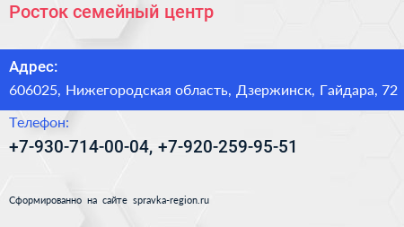 Росток, семейный центр по адресу 606025, Нижегородская область, Дзержинск, Гайдара, 72 в дальнейшем Организация, размещена в следующих категориях: