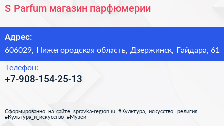 S Parfum, магазин парфюмерии по адресу 606029, Нижегородская область, Дзержинск, Гайдара, 61 в дальнейшем Организация, размещена в следующих категориях: