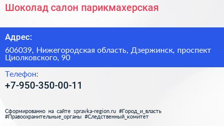 Шоколад, салон-парикмахерская по адресу 606039, Нижегородская область, Дзержинск, проспект Циолковского, 90 в дальнейшем Организация, размещена в следующих категориях: