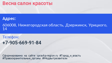 Весна, салон красоты по адресу 606008, Нижегородская область, Дзержинск, Урицкого, 14 в дальнейшем Организация, размещена в следующих категориях: