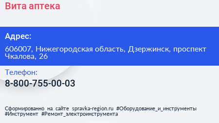 Вита, аптека по адресу 606007, Нижегородская область, Дзержинск, проспект Чкалова, 26 в дальнейшем Организация, размещена в следующих категориях: