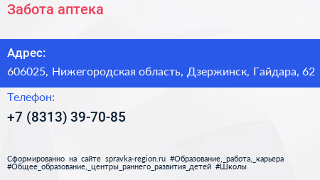 Забота, аптека по адресу 606025, Нижегородская область, Дзержинск, Гайдара, 62 в дальнейшем Организация, размещена в следующих категориях: