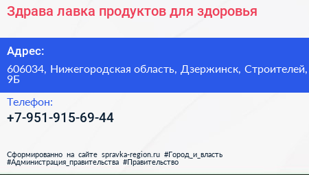 Здрава, лавка продуктов для здоровья по адресу 606034, Нижегородская область, Дзержинск, Строителей, 9Б в дальнейшем Организация, размещена в следующих категориях: