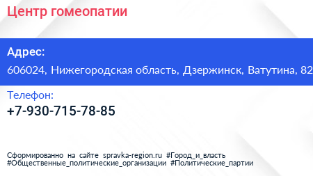 Центр гомеопатии по адресу 606024, Нижегородская область, Дзержинск, Ватутина, 82 в дальнейшем Организация, размещена в следующих категориях:
