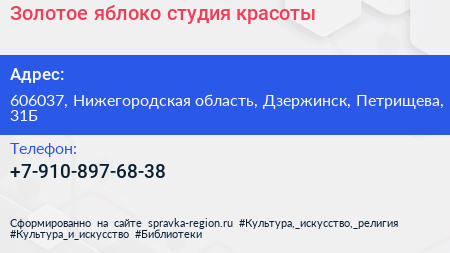 Золотое яблоко, студия красоты по адресу 606037, Нижегородская область, Дзержинск, Петрищева, 31Б в дальнейшем Организация, размещена в следующих категориях: