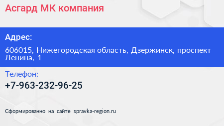Асгард МК, компания по адресу 606015, Нижегородская область, Дзержинск, проспект Ленина, 1 в дальнейшем Организация, размещена в следующих категориях: