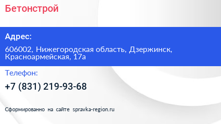 Бетонстрой по адресу 606002, Нижегородская область, Дзержинск, Красноармейская, 17а в дальнейшем Организация, размещена в следующих категориях: